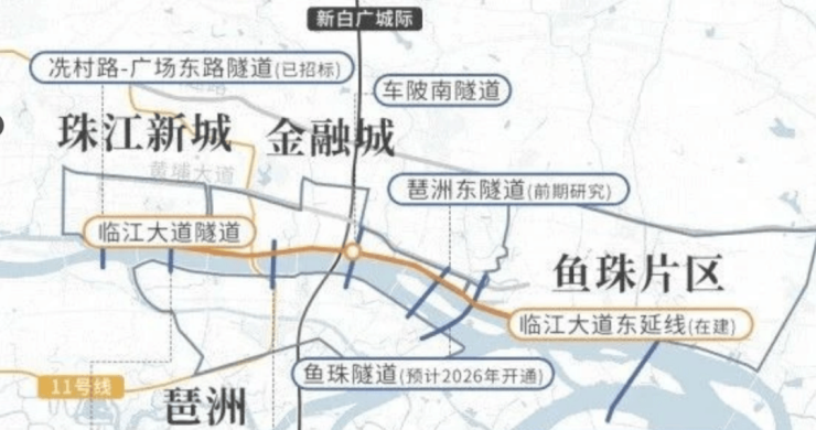 与此同时,新白广城际也将在今年开通,琶洲和金融城的距离将缩短成一个站。其实,去年开通的11号线,已经实现了这一点。未来,随着琶洲与鱼珠隧道,琶洲与珠江新城隧道的开通,一江两岸将被彻底缝合。