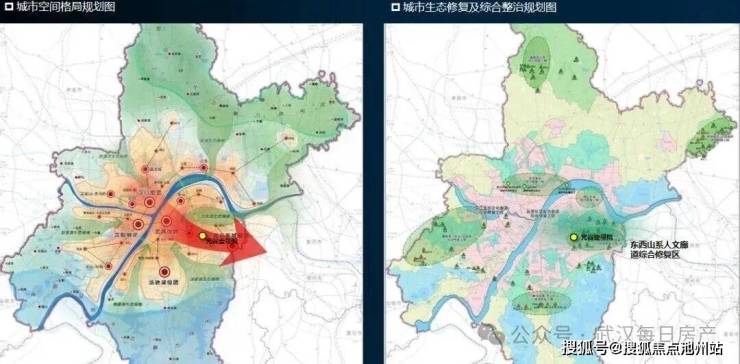 将《城市空间格局规划图》与《城市生态修复及综合整治规划图》叠加会发现,项目既处在武汉政治经济走廊的主轴线上,又被纳入武汉人文生态修复走廊的东西山系修复走廊。