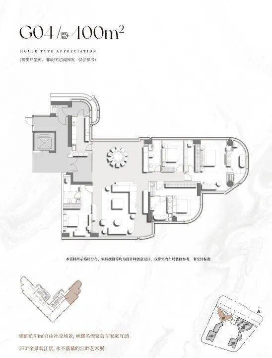 项目首推2栋建面200-400㎡南向一线临江大平层,项目主推户型层高达3.5-3.9米,低区户型层高3.5米,打造通透立体空间;高区户型层高3.9米,结合挑高客厅设计,营造“空中别墅”般的体验。住宅4层起,户型分布,分成低区、中区、高区。 中区是6梯5户设计,户型为210㎡、220㎡、280㎡、340㎡、350㎡。 高区是6梯4户设计,户型是285㎡、330㎡、400㎡。