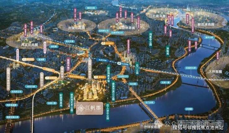 「海成江帆郡」邻近的有大石坝的「悦荟」,冉家坝的「源著天街」,沙坪坝的「金沙天街」,观音桥的「北城天街」,5km享受各大商圈配套。