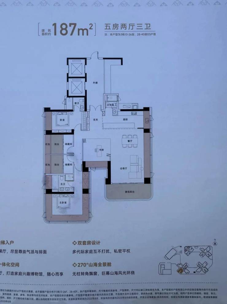 将地标高度/创新设计/极致景观/自然融合四大要素集于一体,约150米地标建筑以45°错位转体设计,实现四户分踞四角的独立瞰景布局,每户均可享有极致山海景观。约55米超宽楼间距、0.6的黄金窗墙比远超常规住宅0.3-0.5的标准,呈现山景、海景、花园三重景观界面。