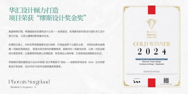 建筑大师:特邀深超总/前海豪宅同款设计团队华汇设计操刀,其作品从全球近3.8万件中脱颖而出,斩获有“设计界奥斯卡”之称的2024年国际奖项协会(IAA)缪斯设计奖金奖,该奖项仅约1%作品可获最高荣誉;
