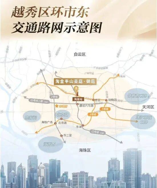 项目离地铁5号线淘金站仅约600百米,5站直达珠江新城。周边还有12号线、13号线2期在建中,主城繁华随心链接。