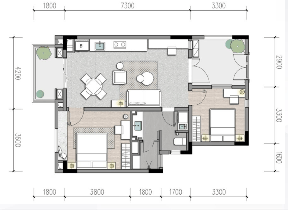 ·一体化客餐厨:约4.2米面宽,30.66㎡,布局灵活多变;