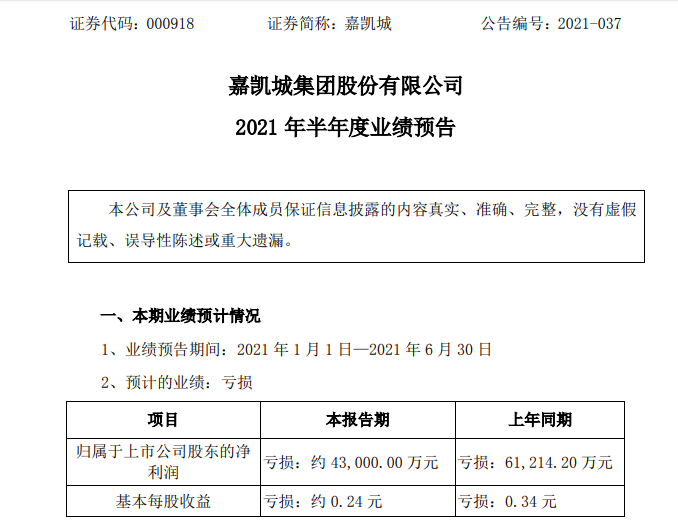 根据公告,前6月嘉凯城预计经营业绩为亏损,归属于上市公司股东的净利润亏损约4.3亿,基本每股收益亏损约0.24元。
