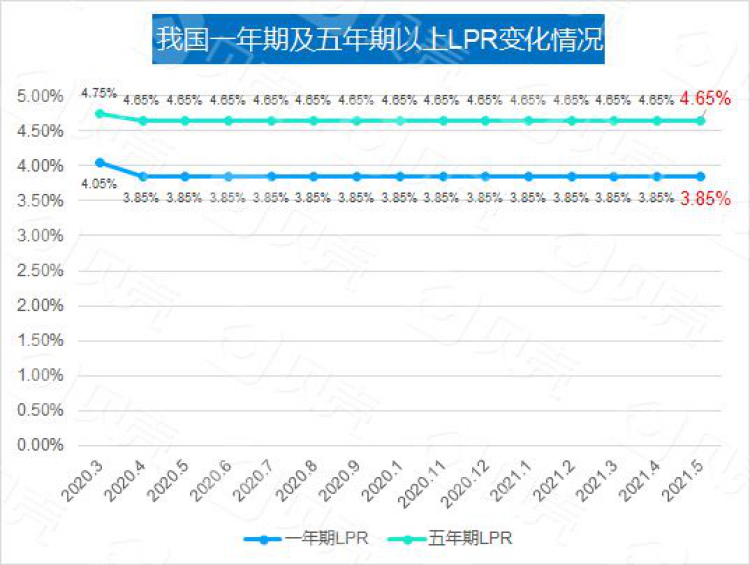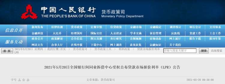 2021年5月20日,央行公布了LPR较新报价:5月LPR报价与上月持平,1年期LPR为3.85%,5年期以上LPR为4.65%。以上LPR在下一次发布LPR之前有效。