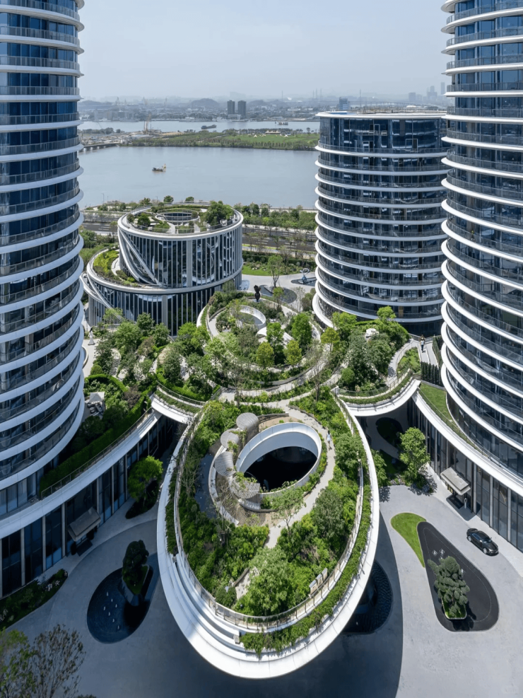 广州「鹏瑞一号」占地约5.42万㎡,共规划有六栋圆柱外型建筑,包含1号公寓、奢华酒店、高端定制商业、艺术中心、广州深湾会、停机坪等复合业态。