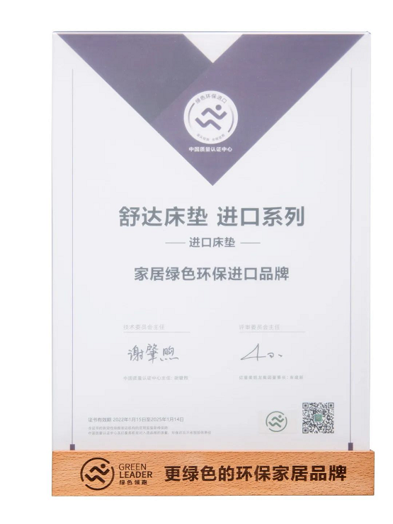 2022年1月,由中国质量认证中心权威评测认证、红星美凯龙集团牵头的绿色领跑项目正式揭晓,舒达床垫赢得其中两项认证:“家居绿色环保领跑品牌”、“家居绿色环保进口品牌”。