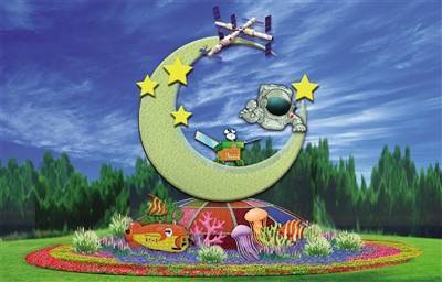 花坛底部直径48米,为向日葵图案,寓意朵朵葵花向太阳。花坛顶高18米,篮体高16米,篮盘直径12米,在篮体南侧书写“祝福祖国 1949-2022”字样,在篮体北侧书写“喜迎二十大”字样。二十大会议期间,“喜迎二十大”将更换为“喜庆二十大”字样。