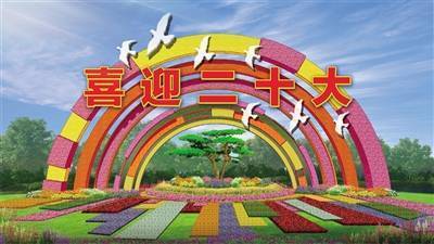 以彩虹门为主景,镶嵌有“喜迎二十大”组字,烘托喜迎盛会的喜庆氛围,以实际行动和优异的成绩迎接党的二十大胜利召开。二十大会议期间,“喜迎二十大”将更换为“喜庆二十大”。