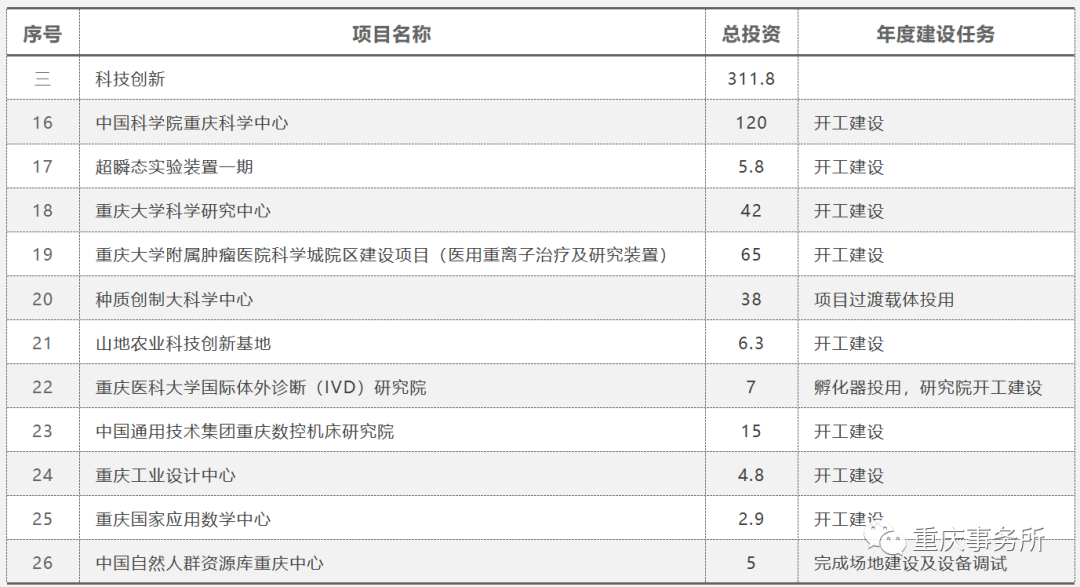 第三类是科技项目,中国科学院重庆科学中心项目总投资达120亿元。此前事务君也提到,当前我国大科学设施主要由中国科学院发起和使用,所以未来如何利用好中国科学院的资源,是科学城发展的关键。这个项目已经动工了,高开投集团在1月23日正式进场。超瞬态实验大科学装置今年也将开工建设。这个项目的主要由重庆大学负责。从下表可见,重大在科学城还要建设科学研中心、附属肿瘤医院,角色吃重。这也体现了重大作为重庆少有一所985院校的实力和责任。