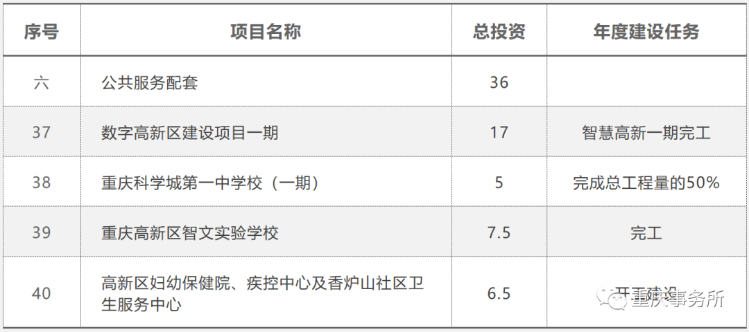 第六类是公共服务。科学城排名前列中学今年要完成50%,高新区智文实验学校则要实现完工。另外,高新区妇幼保健院、疾控中心今年将开工建设。