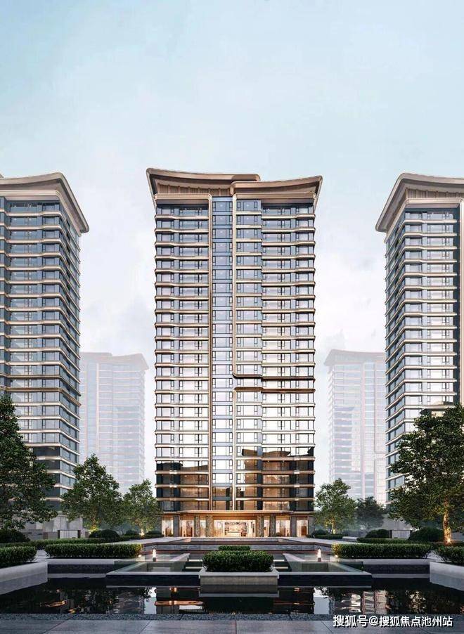 建筑立面以观澜屏玻璃立面辉映江水波澜与天际浩瀚,香槟金格栅是鎏金显贵,黄金缕线条流畅灵动,新中式韵律之美点缀CBD天际线