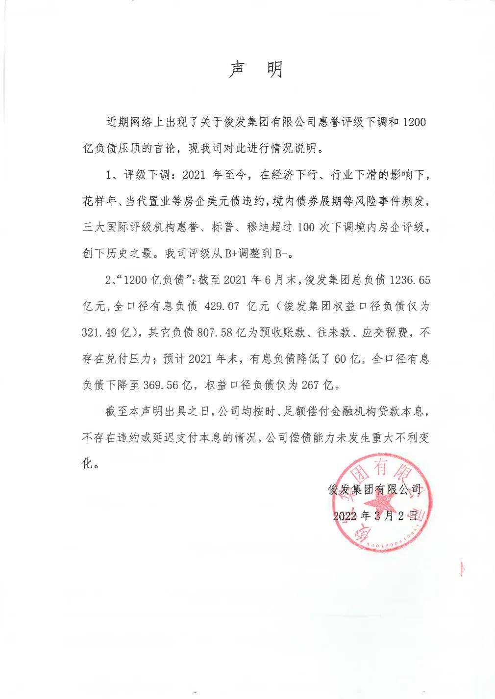 3月2日,俊发集团有限公司针对网络上流传的“信用评级下调”及“1200亿负债”等情况进行回应。该公司发布声明称,公司截至目前均按时、足额偿付金融机构贷款本息,不存在违约或延迟支付本息的情况,公司偿债能力未发生重大不利变化。
