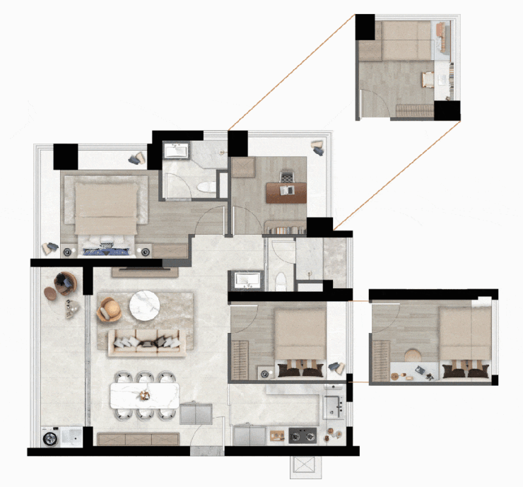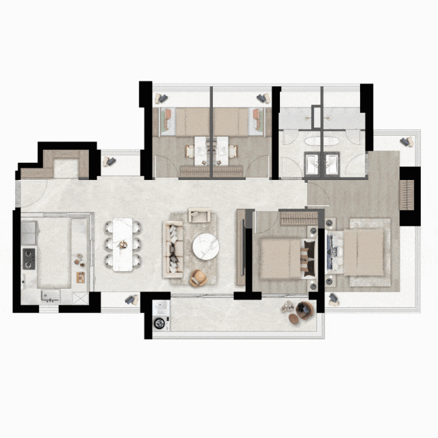 空间的巧思不止于厨房。部分户型中客厅与次卧采用非承重墙隔断,实现了“四居”与“大三居+阔厅”的自由切换。这种可生长的空间结构,让家的格局能伴随孩子的成长、父母的到来而灵活调整,真正实现全生命周期的居住适配。