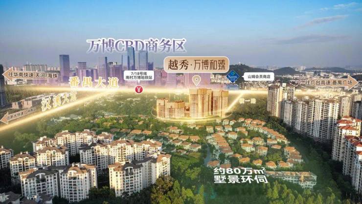 越秀・万博和臻占位番禺万博 CBD 核芯,这里是广州南拓战略的重要节点,汇聚粤海广场、四海城等近 10 个天河城体量的商业综合体 。项目紧邻汉溪大道,无缝接驳番禺大道、新光快速,快速通达海珠、天河;三地铁双站点环绕,距 7 号线与 18 号线交汇的南村万博站约 1.3 公里,7 号线与 3 号线交汇的汉溪长隆站约 1 公里,地铁出行便捷高效。万博未来还将布局文化艺术中心、中央艺术公园等城市地标,项目占位于此,尽享城市发展红利,地段价值不言而喻。