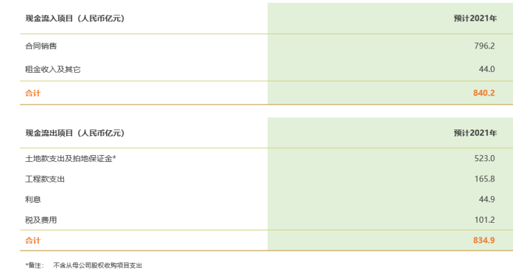 此外,据焦点财经了解,越秀地产现金流入项目预计2021年达到合同销售额为796.2亿元,租金收入及其他为44亿元,合计840亿元,而现金流出项目有土地款支出及拍地保证金的523亿元、工程款支出、利息、税及费用等共计834.9亿元。