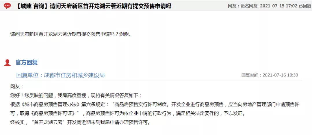 △截自成都市住房和城乡建设局网上政务大厅在不少意向购房者的计划清单里,首开龙湖·云著已经躺了大半年。今年7月中旬,就有网友向成都住建局咨询该项目的取证计划,市场期待值颇高。
