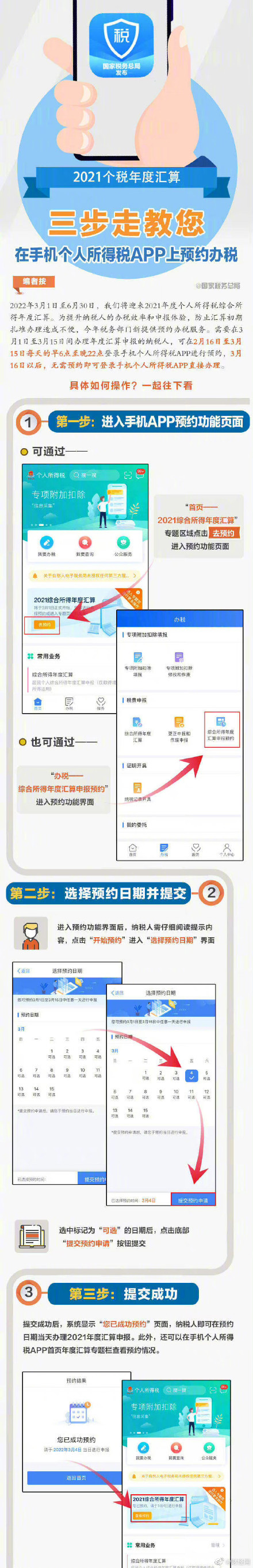 2022年3月1日至6月30日,我们迎来2021年度个人所得税综合所得年度汇算。为提升纳税人的办税效率和申报体验,防止汇算初期扎堆办理造成不便,今年税务部门新提供预约办税服务。需要在3月1日至3月15日间办理年度汇算申报的纳税人,可在2月16日至3月15日每天的早6点至晚22点登录手机个人所得税APP进行预约,3月16日以后,无需预约即可登录手机个人所得税APP直接办理。