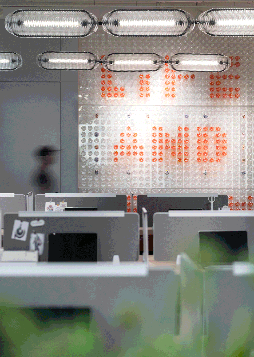 接待区与正式办公区以通透的蓝色亚克力为分界,办公工位灵活,从小型会议舱/灵感舱、半开放快速讨论区/工位围合、全开放的会议桌/洽谈区,以个体办公为圆心,员工日常动线为半径进行合理设置。
