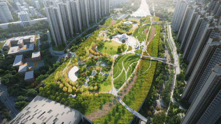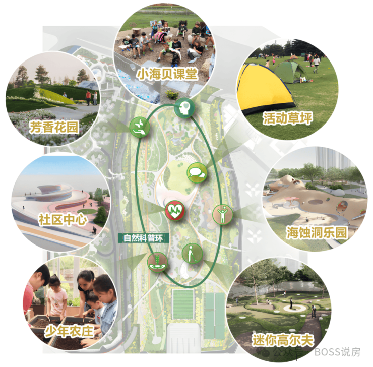 空中花园:拥有约 15 万㎡体量的空中绿岛公园,内部构筑微气候系统,设有 “两环一心八景” 多元活力配套,包括儿童自然科普课堂、海蚀洞儿童乐园、迷你高尔夫球场、芳香花园、社区农场等。