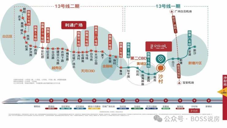 地铁:距离 13 号线沙村地铁站约 400 米,一站可达黄埔区,在建的 13 号线二期开通后,可无需换乘直达珠江新城。