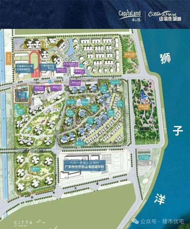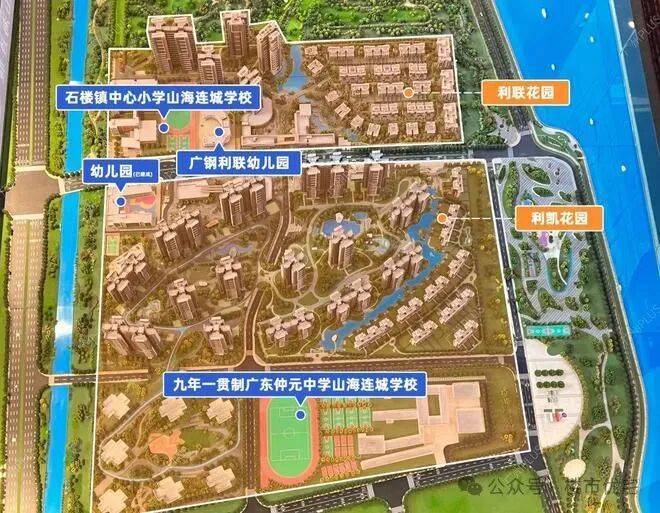 小区自带五所学校,分别为 2 所幼儿园,2 所小学、1 所 48 班中学。目前已有两所幼儿园和一所小学开学,2025 年即将新开一所小学和一所初中。石楼镇中心小学山海连城学校,是一所 24 班的小学,已开学。公立名校,已奠基动工,2024 年封顶,2025 年 9 月正式开学。是一所 72 班中小学,涵盖 24 班小学和 48 班初中的公办全日制九年一贯制学校,是片区目前规模最大的中小学。仲元中学是广东历史名校、中国百强中学等,荣誉众多,师资力量专业精湛,教学理念先进,历年高考成绩优异,招生门槛高。销售称根据三方协议,会保障凯德・山海连城业主(户籍)子女优先入读,但公立学校按学区划分,人户一致优先。