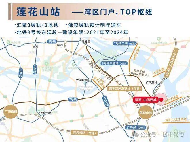 目前公共交通不算好,出行基本靠自驾。最近的地铁 4 号线距离项目 10 公里,周边规划有地铁 8 号线东延线{莲花湾至万胜围},预计 2027 年底通车,全程 8 个站,通车后莲花湾到海珠只要 20 分钟。目前公交线路较少。在建的莲花山枢纽站,开通后 3 站可直达琶洲,但城轨班次不如地铁频密,且小区去往莲花山站有 2 - 3 公里,超出步行可接受范围。