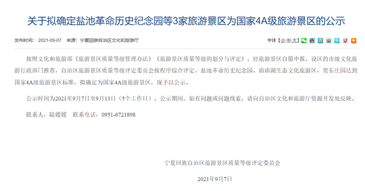 宁夏文旅厅拟新增3家国家4A级旅游景区:盐池革命历史纪念园、庙庙湖生态文化旅游区、贺东庄园。