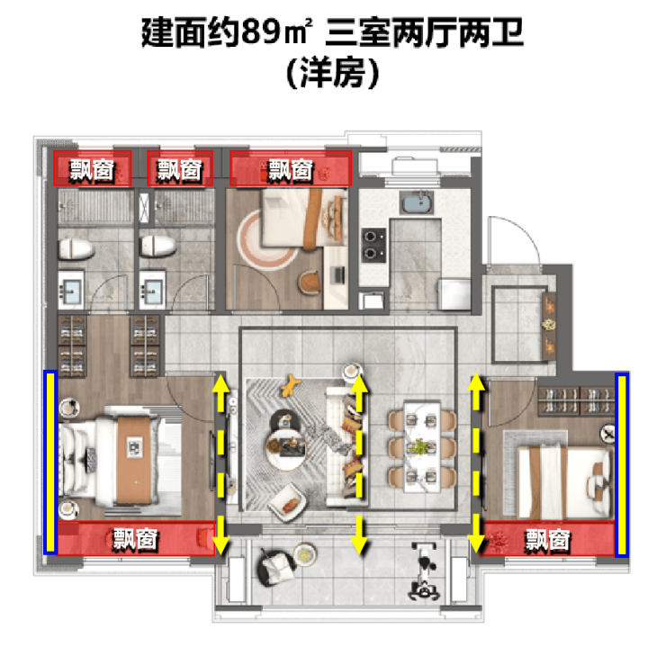 建面约89㎡(三房两厅两卫)