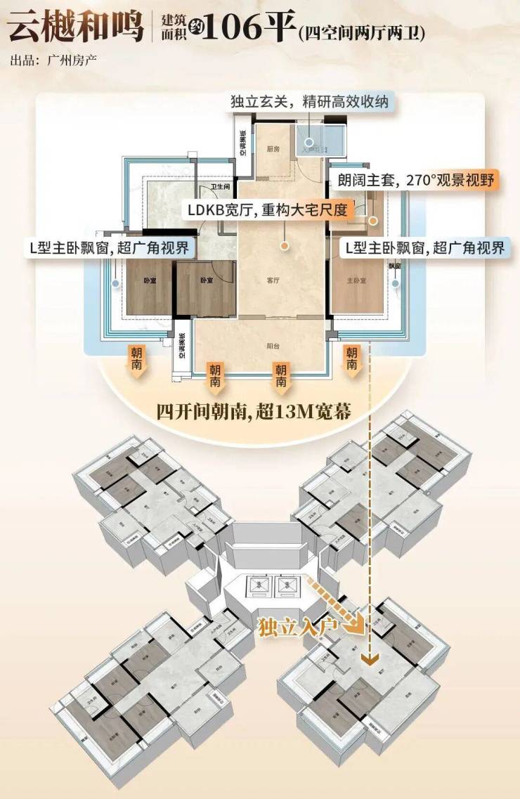 户型亮点:主打约 100-138㎡全南向四房,主力户型四开间朝南,南北双阳台,主卧 270° 飘窗,全屋 “800 库” 收纳系统,LDKB 一体化方厅提升空间利用率。