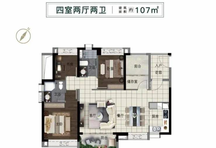 107㎡户型则是横厅设计,四开间朝南,两处灵动空间,可以灵活打造满足不同居住需求。书房、卧室、主卧、餐厅都带飘窗,解决收纳难题。