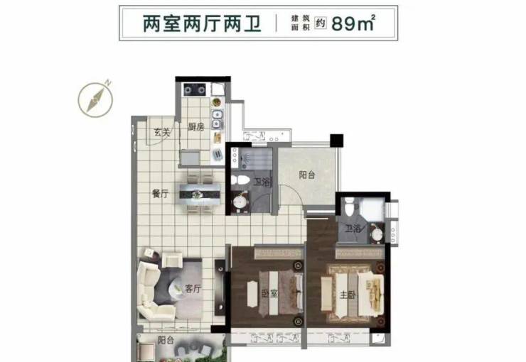 89㎡户型三开间朝南,南向望园林,独享阳光景观,主卧套房设计,更具私密性。
