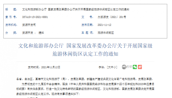 文旅部:开展高级旅游休闲街区认定工作的通知