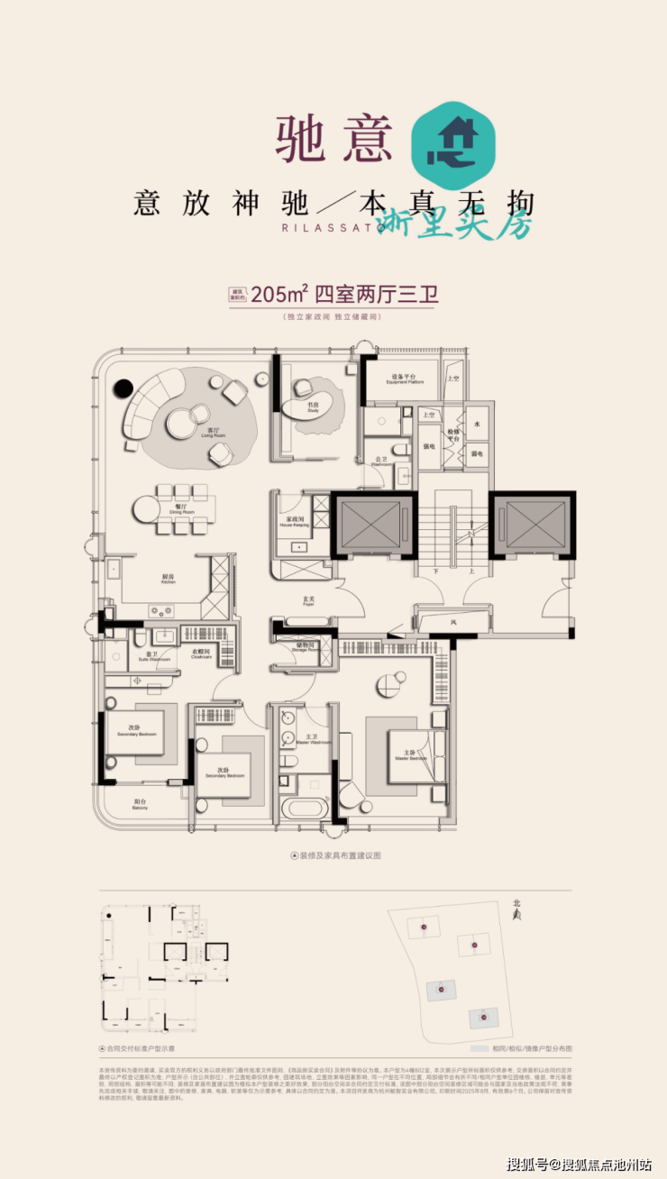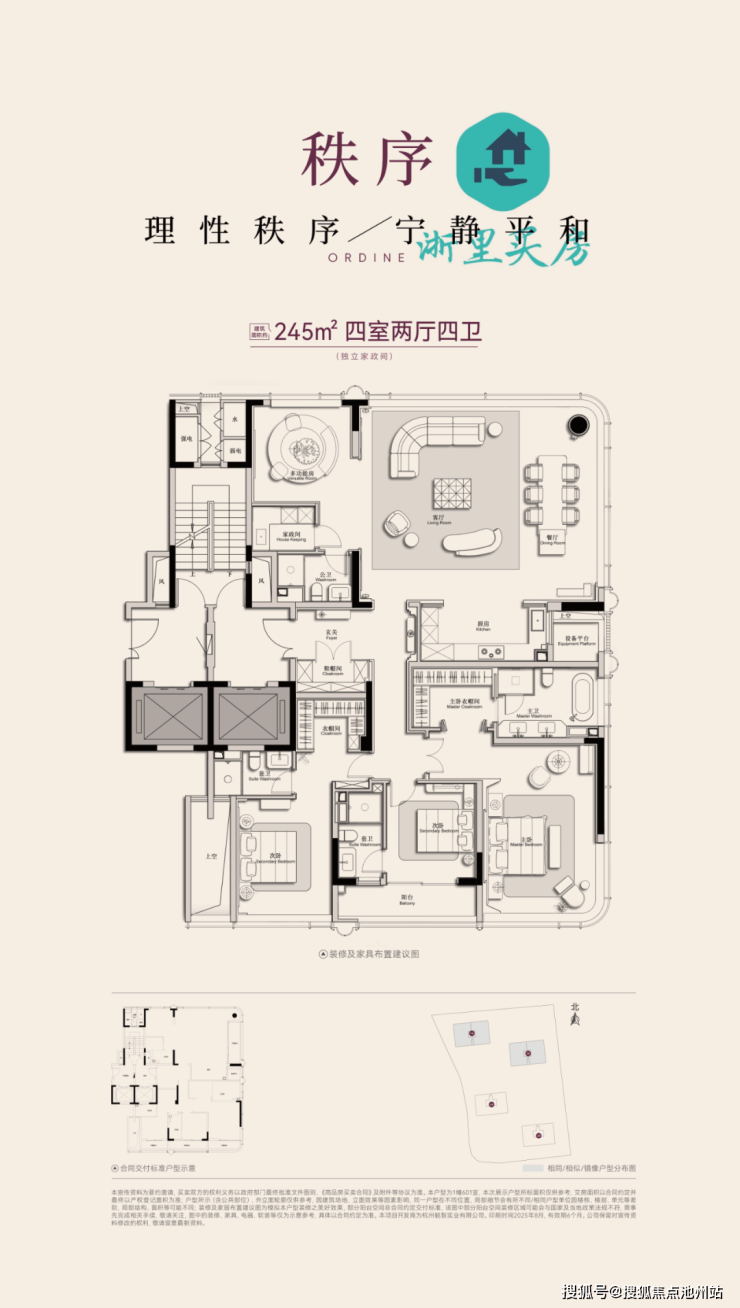 主力户型为建筑面积约205-245㎡的四房两厅,顶跃户型达约310-380㎡,层高3.15-3.3米。户型注重动静分区,主卧套房配备独立衣帽间与卫浴,部分户型沿河北向设270°巨幕落地窗,可将运河风光尽收眼底。