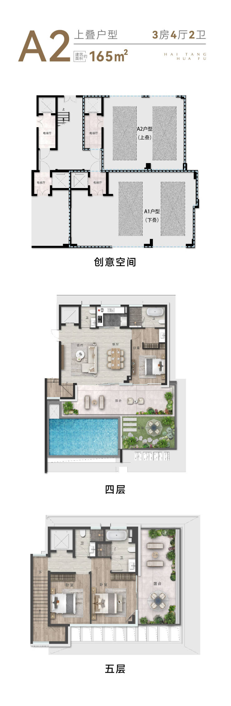 低密栖海叠拼:上叠约165㎡,下叠约163㎡