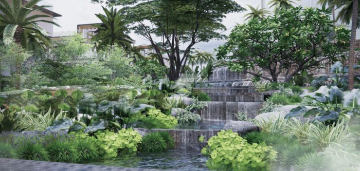延伸滨海生态,遵循适地适树原则,以“一轴多枝众叶”的景观线,注重人与自然的亲密互动,南北向延伸主要枝干,东西向延伸交织一期与二期,串联各个叶片生活节点,甄选多种热带植被,规划设计高山流水区、悠然池塘、艺术林下走廊、观景草阶等多重景观点,呈现浪漫而不失大气的空间交错感,打造成集生态自然,健康活力,舒展身心及沟通交流等复合型空间,营造悠然的生活雅境。