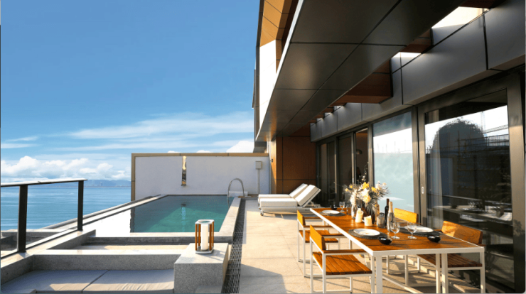 国家海岸寸土寸金,70年大产权属性的土地更加珍贵。项目深入考量时代峯层人士的高品质度假生活需求,以约0.6容积率、45%绿地率的奢阔尺度,建筑纯粹亲地建筑群,让生活和土地、自然保持更为亲密的距离,回应时代滨海生活的品质需求。