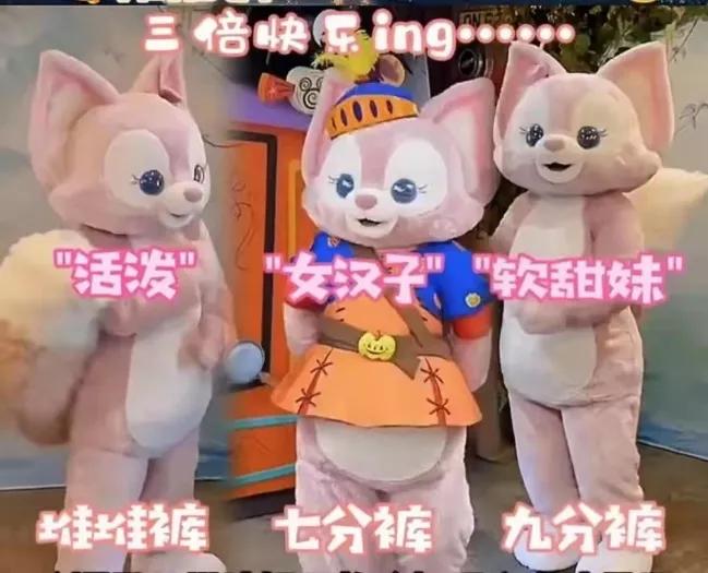 迪士尼乐园中的卡通角色往往是由多个工作人员轮番扮演的,观察到这一现象的游客根据玲娜贝儿裤腿到脚踝的长度,创造出了“七分裤儿儿” “九分裤儿儿”和“堆堆裤儿儿”三个角色影分身。B站的观众老爷们还根据三个工作人员动作习惯的不同总结出了三个“儿儿”各自的特点: