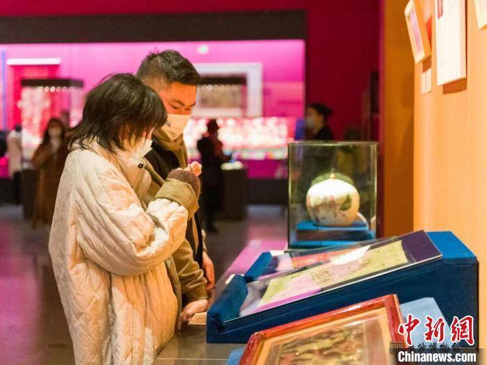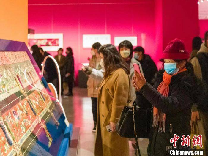 中新网长沙1月17日电 (邓晓丽 李韵佳)唐代的“嫦娥奔月”葵花纹铜镜、元代的银鎏金“桃花双鸾”脚簪、明代的“人物祝寿”铜镜、民国的紫地纳绣“连生贵子”挂饰……1月17日,长沙博物馆迎新春原创大展“喜湘逢——湖南吉祥艺术大观”开幕,来自湖南15家文博机构的190件吉祥文化主题展品亮相,为2023年新春增添了一番别样的喜庆。