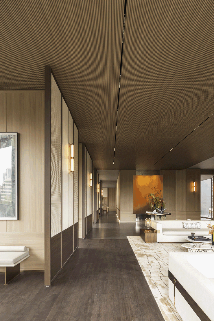 挑高开阔的会所没有过多装饰,以简洁的立面、温润的木材质感和细腻的石材,共同营造出一种优雅大气、舒适自在的氛围。