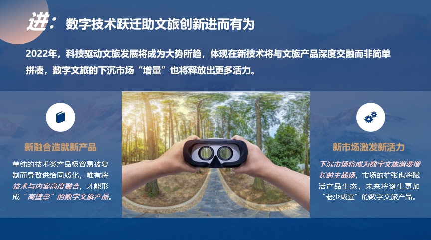 道阻且长,行则将至。虽然危机犹在,但在这一年,文旅行业依旧危中寻机,释放出新信号、呈现出新特征。尽管中远程旅游活动减少,短途游、周边游却成为出游新常态,并实现量价齐升、提质升级;“七普”数据展现出中国人口变化的趋势和机遇,“一老一小”消费前景广阔,康养旅游、亲子旅游、研学旅行等成为市场新热点;新技术、新场景、新应用夯实文旅“新基建”,大数据、云平台、沉浸式、光影科技、人工智能、产业互联网等加速演进,带来全新发展动能;实现碳达峰、碳中和的“双碳”目标加速文旅行业的绿色转型,低碳旅游、绿色旅游逐步成为行业共识。