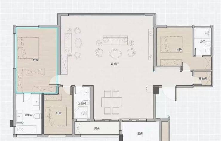 133㎡四房两厅两卫采用经典四叶草布局,四个卧室分布在四角,保障家庭成员的私密空间,客餐厨横向并排设计让空间更通透,主套配备270°视野,高楼层可欣赏江景,适合改善家庭居住。