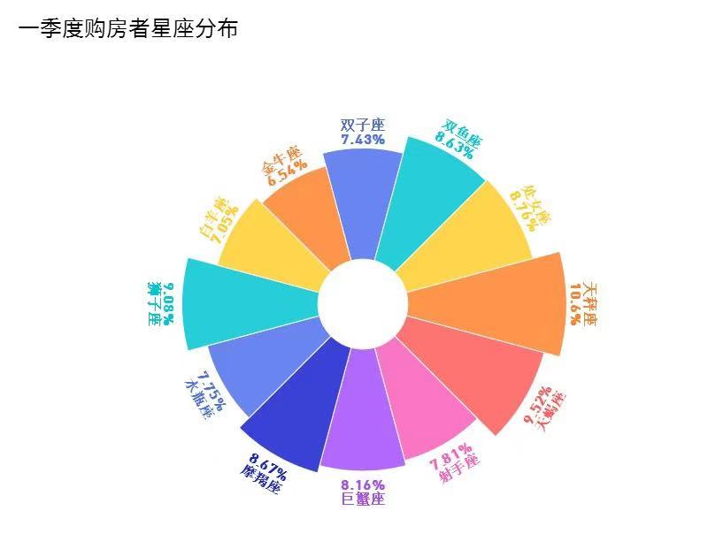 在年轻用户较为关注的买房人群星座分布层面,天秤座买房不纠结,占比较高达到10.6%,务实的天蝎座买房也很积极,占比为9.52%,号称“理财高手”的金牛座占比居然较低,为6.54%。