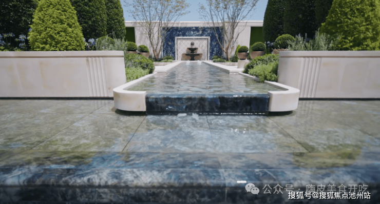 中庭水院景观水池中镶嵌的“蓝翡翠”奢石,独特蓝色光泽如银河深邃。这种来自马达加斯的名贵奢石,色泽深邃而纯净,如同宝石般璀璨夺目。在光线的照射下,蓝翡翠散发出迷人的光泽,让人仿佛置身于梦幻般的仙境之中。