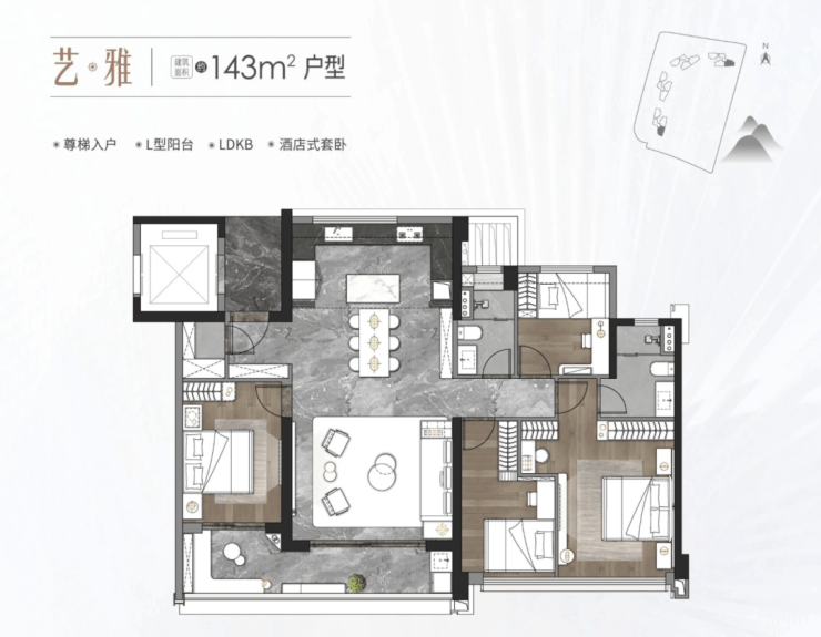 143㎡户型同样尊梯入户,L 型阳台增加了空间的灵动性,LDKB 设计让公共空间更加开阔,酒店式套卧提升了居住的舒适度。