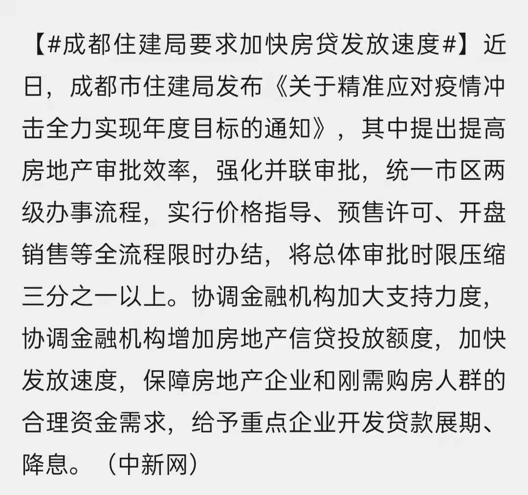 11月23日,成都市疫情防控工作新闻发布会举行。此次会议提及了对于房贷投放的内容,是当前全国排名前列个明确加大房贷投放的城市,具有非常强的信号意义。