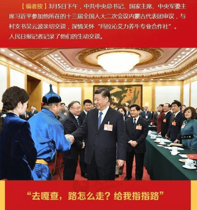 “去嘎查,路怎么走?”“飞机、火车、汽车都可以。”“给我指指路。”“从北京飞到科尔沁通辽机场,然后……我们可以接!”2019年的全国两会上,习近平总书记在参加十三届全国人大二次会议内蒙古代表团审议时,与东萨拉嘎查党支部书记吴云波亲切交谈。回忆起草原地带长久以来“出行难”的往事,吴云波在交谈中介绍了东萨拉嘎查的全面脱贫。