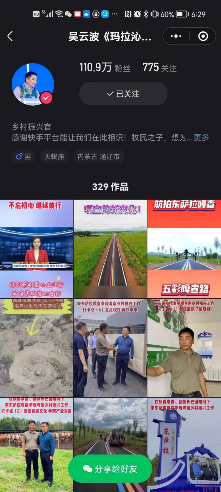在本次狐椒文旅的专访中,吴云波再次提到,总书记谈到的“去嘎查,路怎么走?”,其实为东萨拉嘎查指明了三条路。排名前列条路是致富之路,即东萨拉嘎查当下正在践行的抱团取暖、共同富裕之路;第二条路是幸福之路,东萨拉嘎查引导农牧民在追求物质富裕的同时提升文化层次,促进民族团结;第三条路是智慧之路,嘎查的发展不能原地踏步,要坚持创新,跟上时代步伐,目前东萨拉嘎查正在探索这条智慧之路,通过网络直播进行宣传、销售,利用新技术、新路径、新工具和新手段实现智慧转型。2020年,受疫情影响,合作社的产品一度出现滞销,为拓展销路,吴云波尝试通过短视频平台进行直播带货,仅用了一年时间,他的短视频宣传已达到5.7亿点击量。