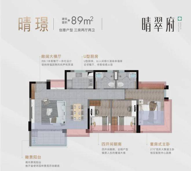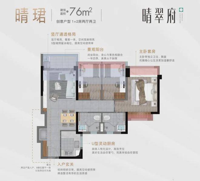 卓越・晴翠府户型建面约 76 - 130㎡三至四房宽景臻品。为确保采光和楼间距,楼栋以 V 字型、蝶型、枪型呈现,不规则排布最大化楼间距,最小化视线干扰。76㎡户型布局精巧,功能齐全,满足小家庭需求;86 - 89㎡户型空间利用合理,可能设置宽敞阳台,增加采光与观景视野;116㎡户型通常会有更开阔的客厅和卧室,可能配备独立书房或衣帽间,提升居住舒适度;130㎡户型则注重空间的奢阔感,多房间设计满足家庭不同需求,为改善型购房者提供高品质居住选择。